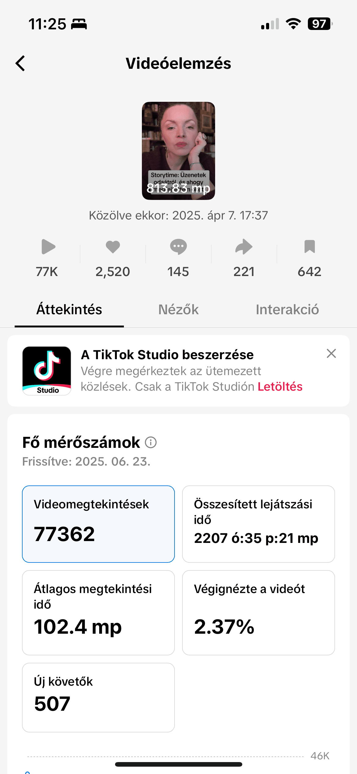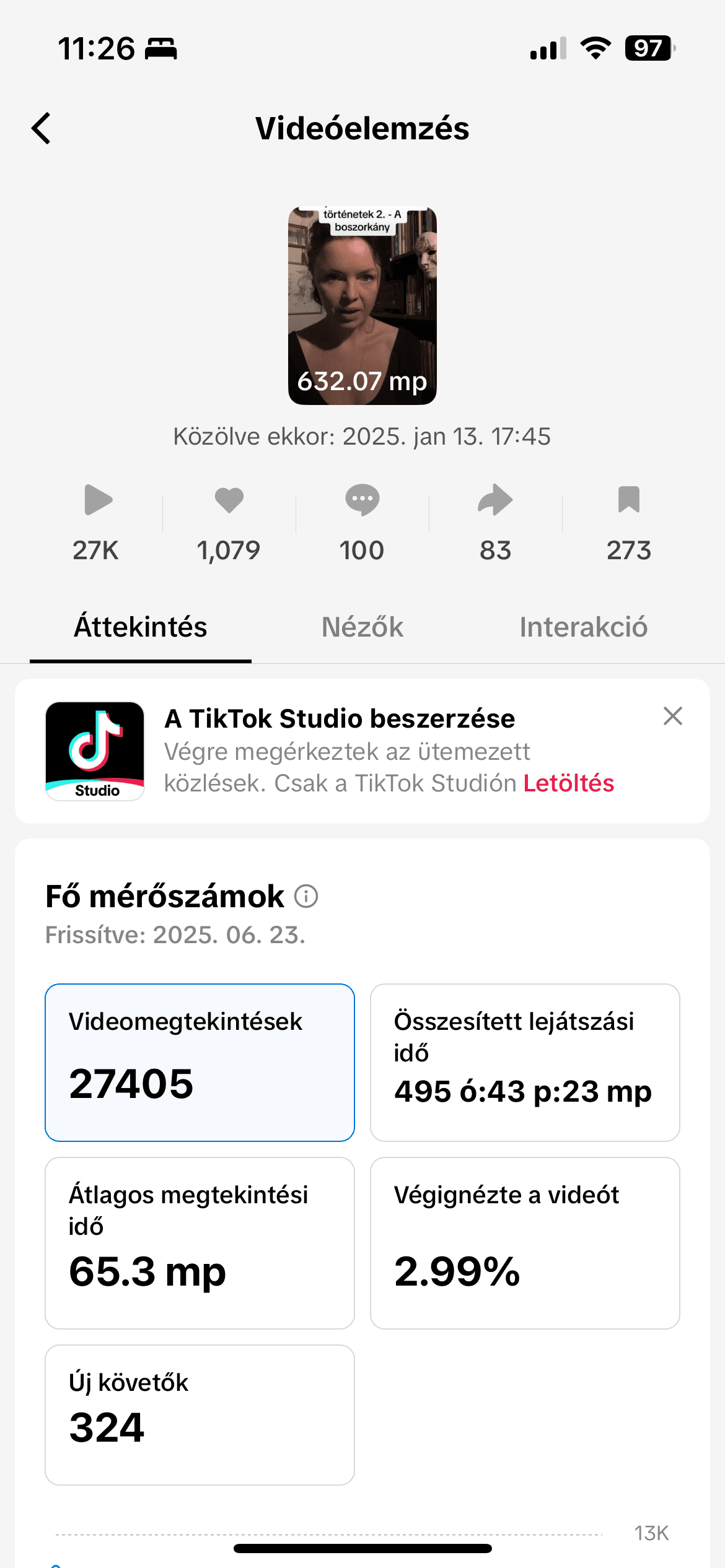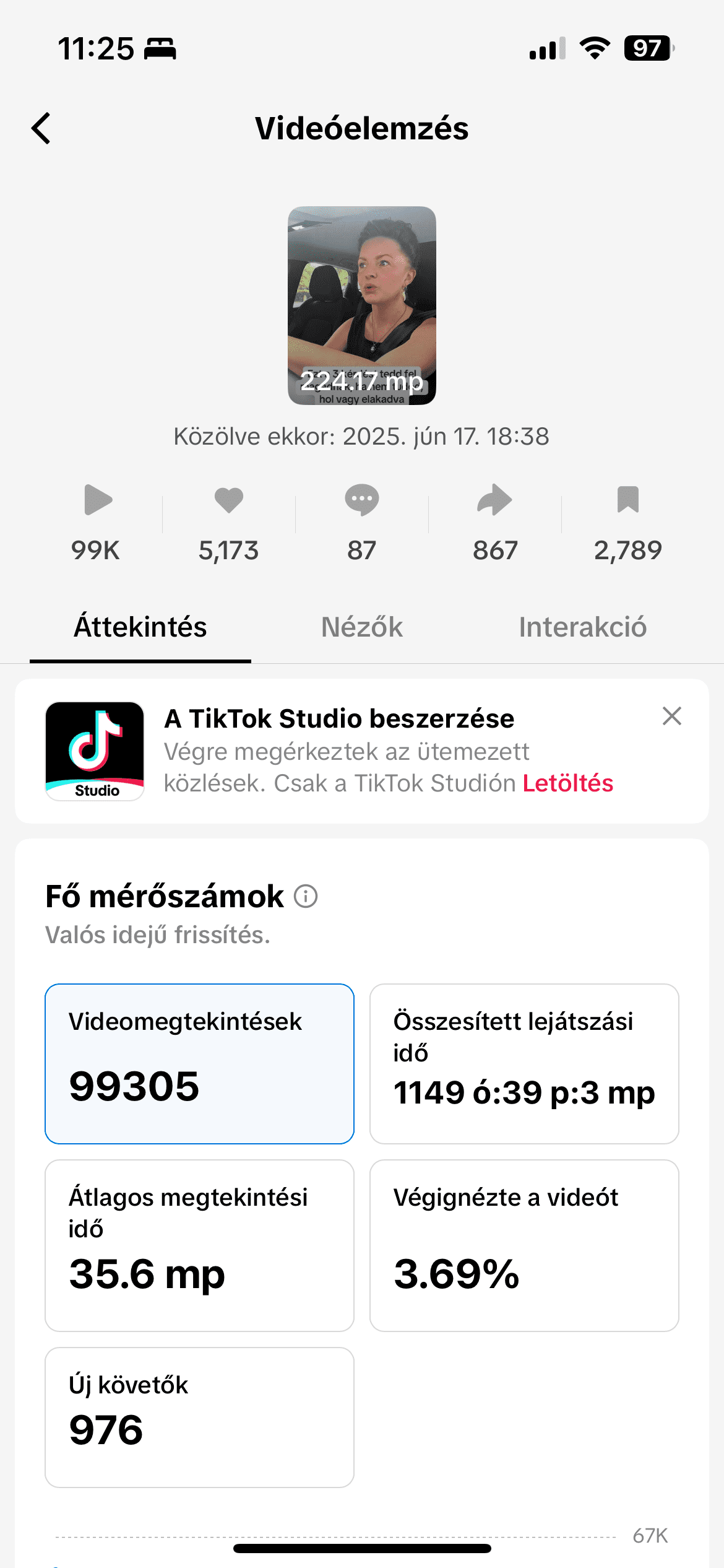 A képeken néhány videóm statisztikáját láthatod. Ezek a számok nem a véletlennek vagy a szerencsének köszönhetőek, hanem a tudatosságnak, az intuitív kísérletezésnek, a történetmesélés erejének, az átgondolt szerkesztésnek és a témaválasztásnak. És a legfontosabbnak, amiről a workshopon is szó lesz: annak, hogy az emberek nem azt szeretik, ami tökéletes, hanem azt, ami valódi.